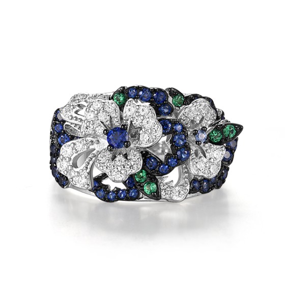 Sterling Silver w/ Black White Plating Ring Created Sapphire,Synthetic Green Spinel,White Cubic Zirconia (R321357CSGZSK925)