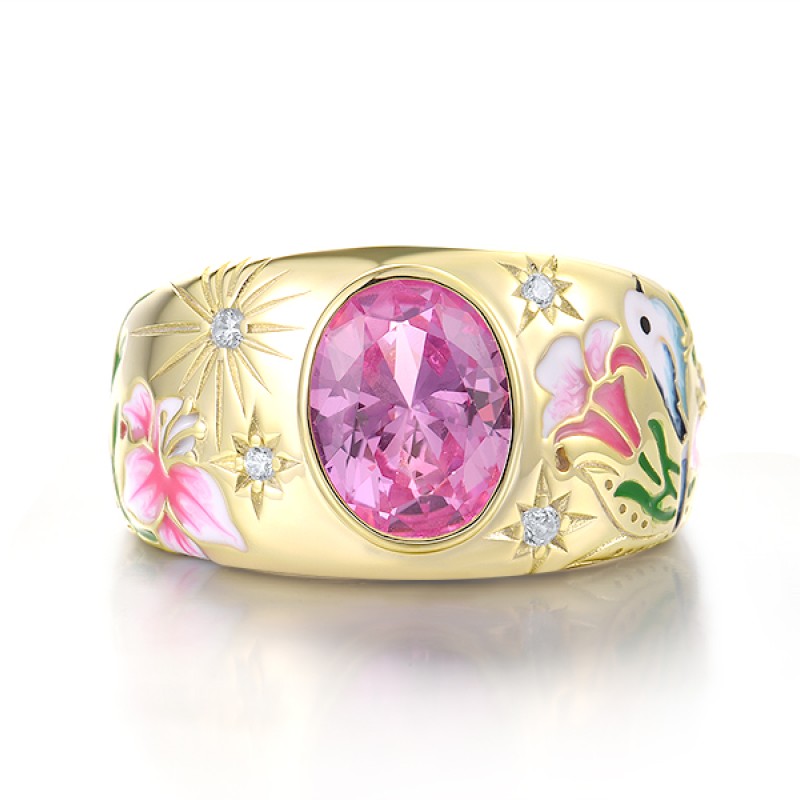 Sterling Silver w/ Yellow Plating Ring Created Pink Sapphire,Enamel,White Cubic Zirconia (R321972ENASY925)