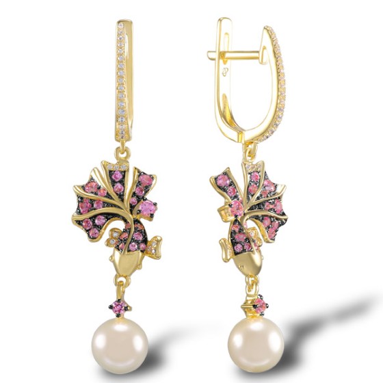 Sterling Silver w/ Yellow Plating Earrings Created Pink Sapphire,Fresh Water White Pearl,White Cubic Zirconia (E305159CPFZSY925)
