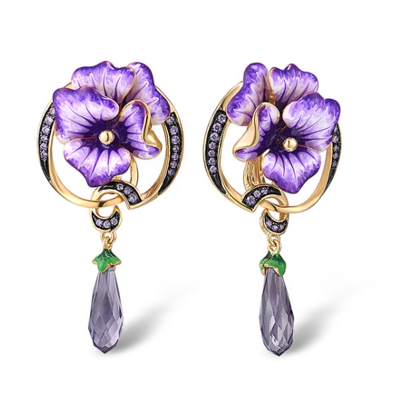 Sterling Silver w/ Yellow Black Plating Earrings Purple Glass,Amethyst Cubic Zirconia,Enamel (E313946ENASC925)