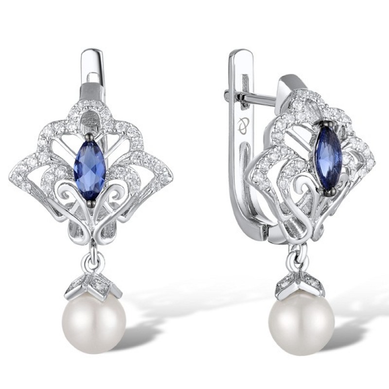 Sterling Silver w/ Black White Plating Earrings Blue Glass,Fresh Water White Pearl,White Cubic Zirconia (E311077BGFZSK925)