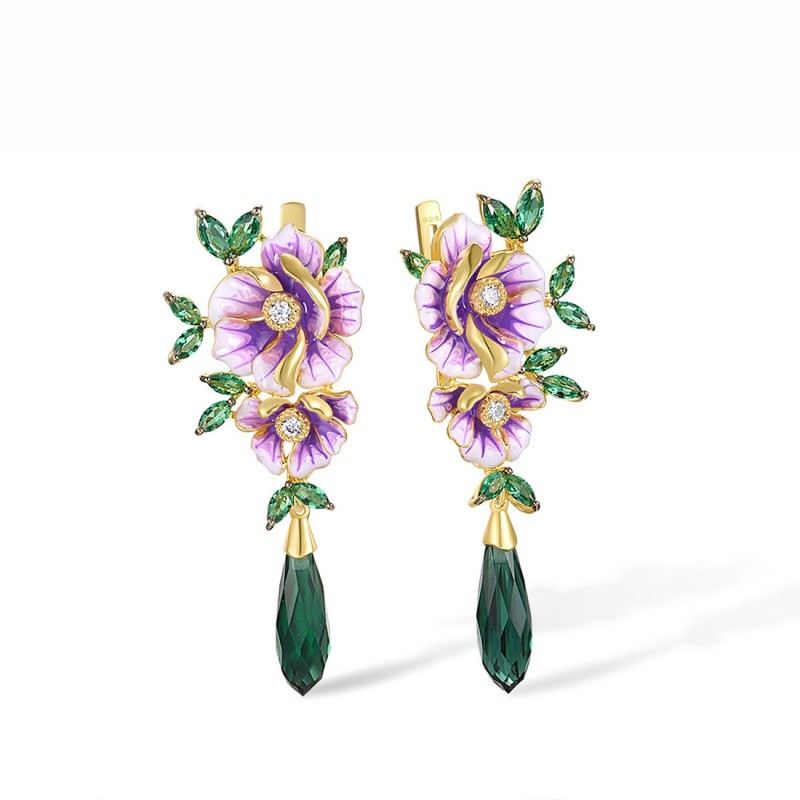 Sterling Silver w/ Yellow Black Plating Earrings Enamel,Green Glass,Green Spinel,White Cubic Zirconia (E313938ENASC925)