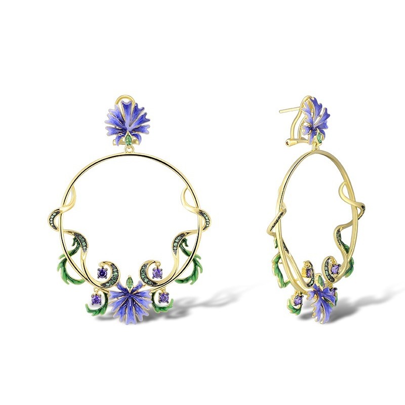 Sterling Silver w/ Yellow Black Plating Earrings Dark Purple CZ,Enamel,Green Spinel (E312815ENASC925)