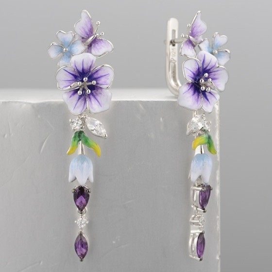 Sterling Silver w/ Black White Plating Earrings Created Purple Nano Spinel,Enamel,White Cubic Zirconia (E314129ENASK925)