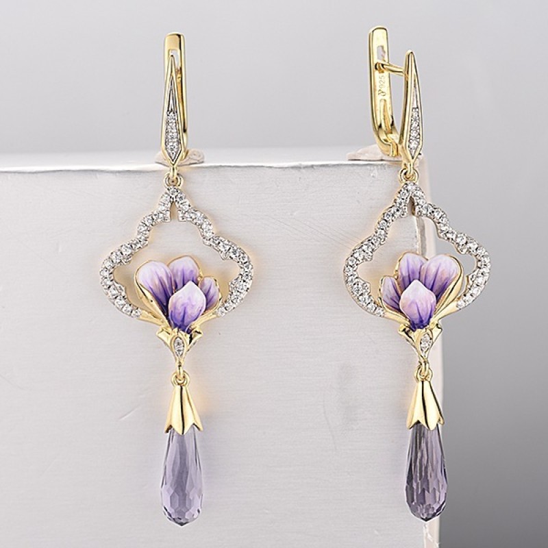 Sterling Silver w/ IONIC YELLOW PLATING Earrings Enamel,Purple Glass,White Cubic Zirconia (E313939ENASP925)
