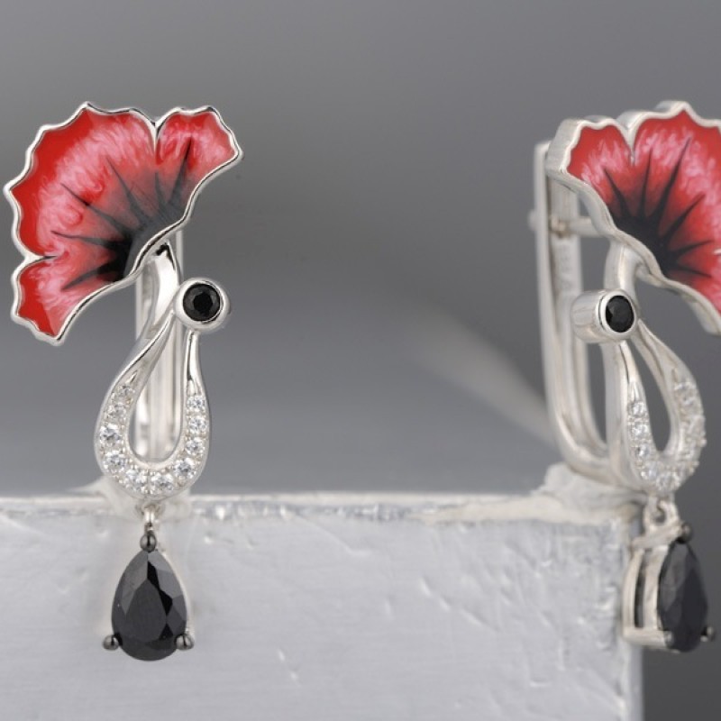 Sterling Silver w/ Black White Plating Earrings Black spinel,Enamel,White Cubic Zirconia (E313933ENASK925)