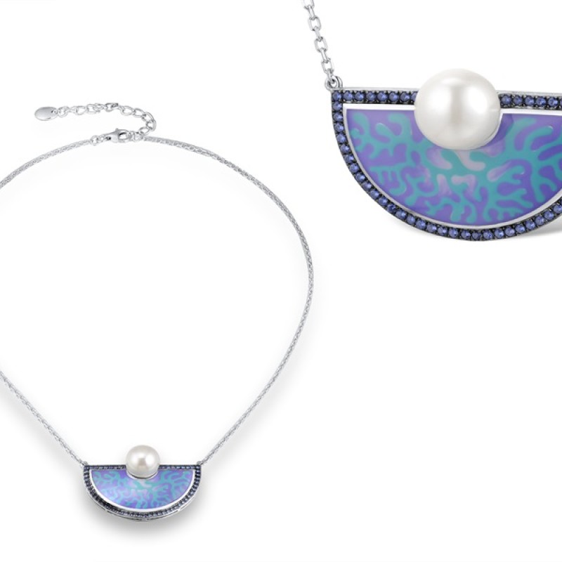 Sterling Silver w/ Black White Plating Necklace Blue Nano Cubic Zirconia,Enamel,White Shell Beads (N312848ENASK925)
