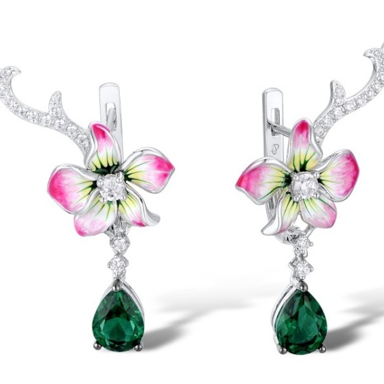 Sterling Silver w/ Black White Plating Earrings Enamel,Green Glass,White Cubic Zirconia (E312061ENA1SK925)