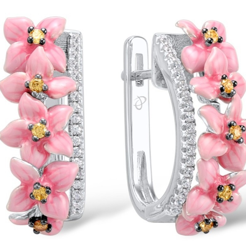 Sterling Silver Earrings Enamel,White Cubic Zirconia,Yellow Cubic Zirconia (E308014ENASL925)