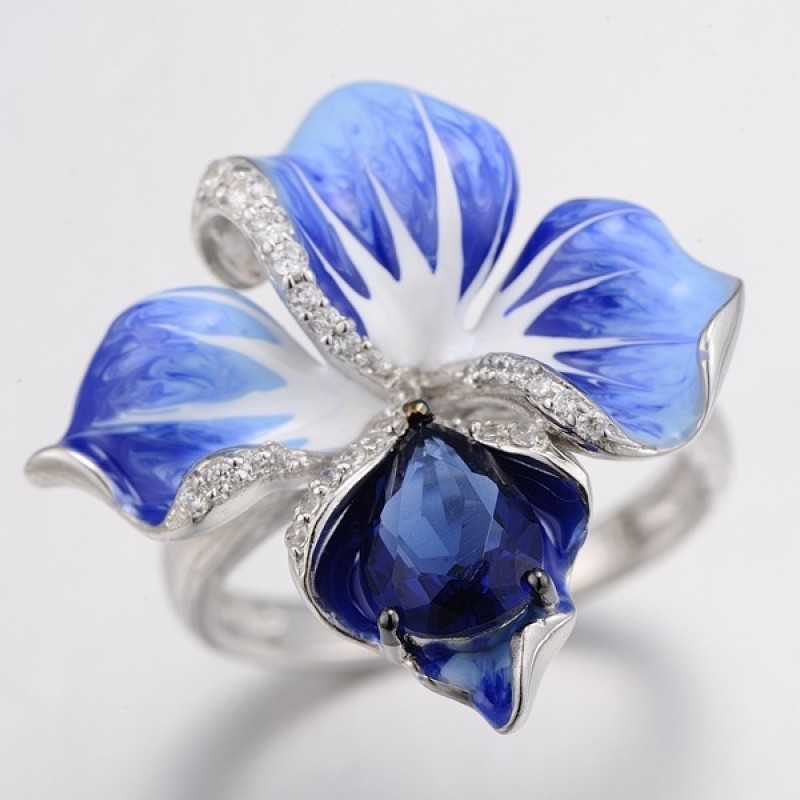 Sterling Silver w/ Black White Plating Ring Blue Glass,Enamel,White Cubic Zirconia (R306767ENA2SK925)