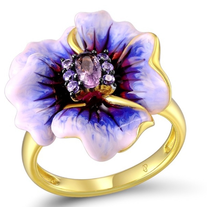 Sterling Silver w/ Yellow Plating Ring Dark Purple CZ,Enamel,Purple Glass (R306765ENA1SY925)