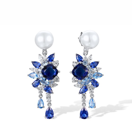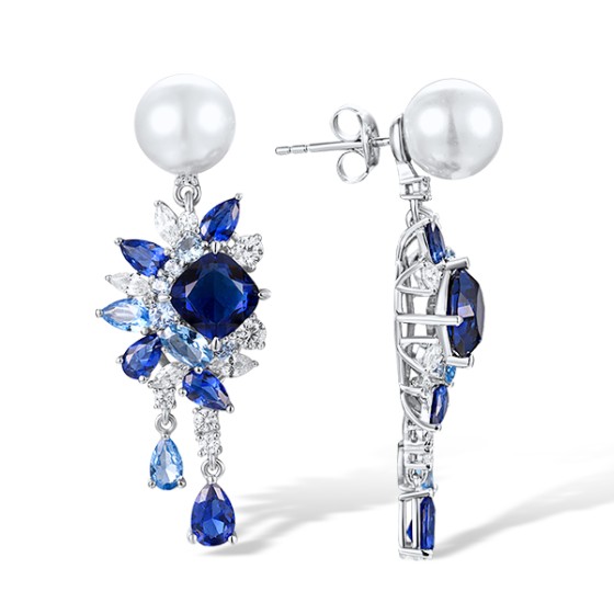 Sterling Silver Earrings Blue Glass,Blue Nano Cubic Zirconia,Blue Spinel,White Cubic Zirconia,White Shell Beads (E317714MULSL925)