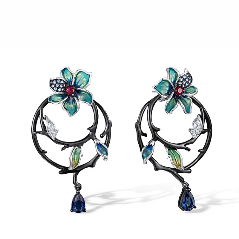 Sterling Silver w/ Black White Plating Earrings Blue Glass,Blue Spinel,Created Ruby,Enamel,White Cubic Zirconia (E311885ENASK925)