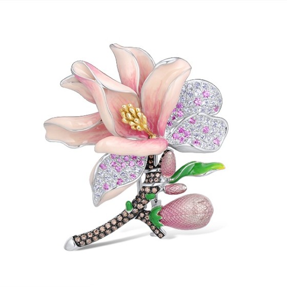 Sterling Silver w/ Yellow Black White Plating Brooch White Topaz,Chocolate CZ,Created Pink Sapphire,Enamel (O314119ENASZ925)