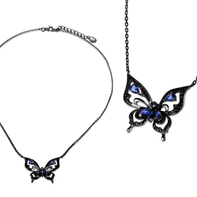 Sterling Silver w/ Black Plating Necklace Black spinel,Blue Glass,Blue Nano Cubic Zirconia (N311887BGBNSB925)