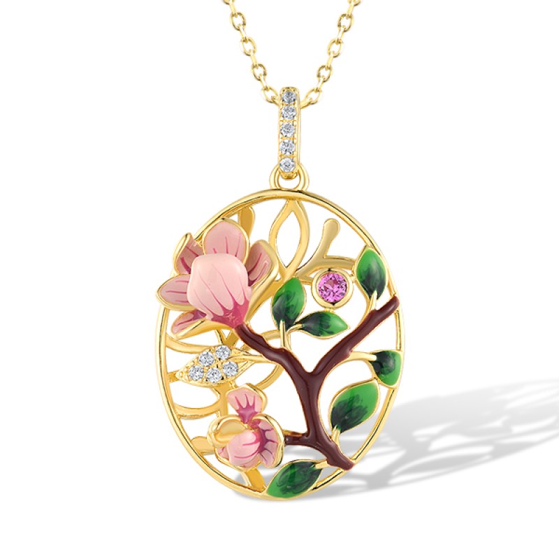 Sterling Silver w/ Yellow Plating Pendant Created Pink Sapphire,Enamel,White Cubic Zirconia (P320020ENASY925)