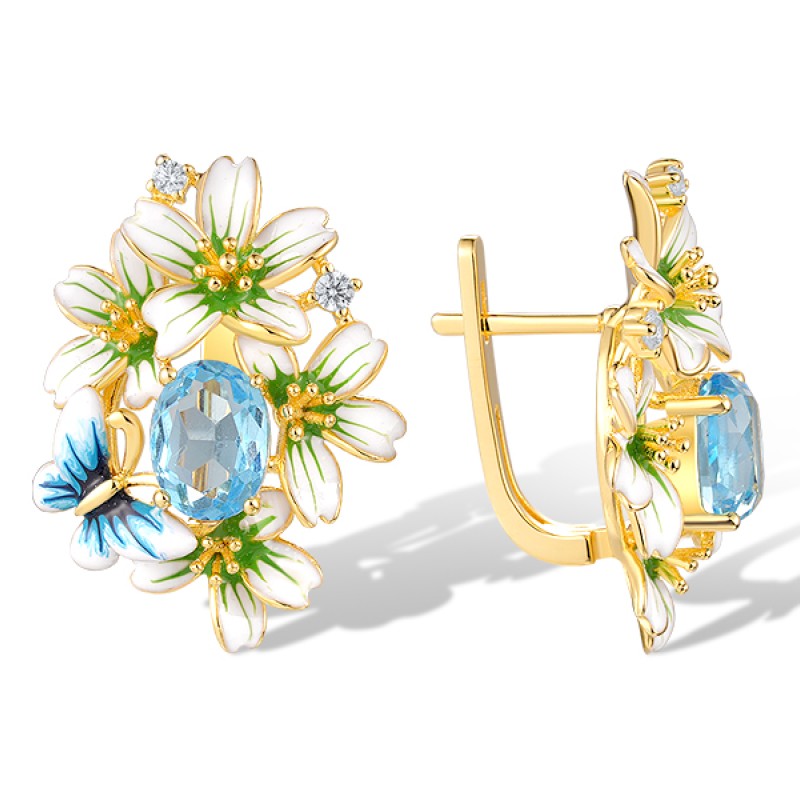 Sterling Silver w/ Yellow Plating Earrings Blue Glass,Enamel,White Cubic Zirconia (E320595ENASY925)